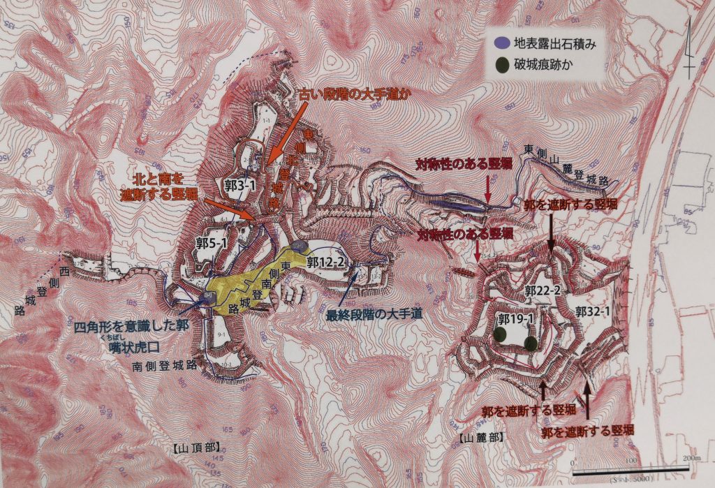 発掘調査では結城秀康段階の普請と推測される土塁石積みが、山頂部および山麓部で確認されている。