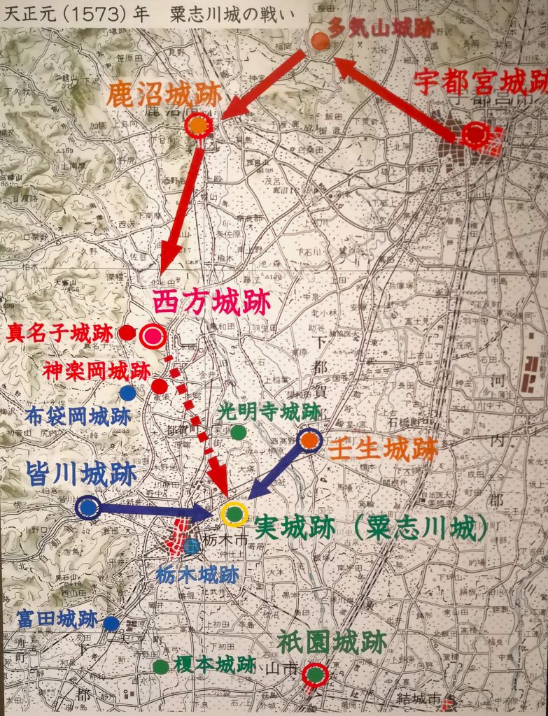 ちなみに、栃木市教育委員会が粟志川城の合戦の状況を現代の地図に落としているので、参考までに掲載する。赤色の矢印が反北条の佐竹・宇都宮氏勢力の動きで、青色の矢印が北条勢力の皆川・壬生両氏の動きを示す。壬生城主は、鹿沼城の壬生周長と対立する壬生綱雄(周長の甥)であった。